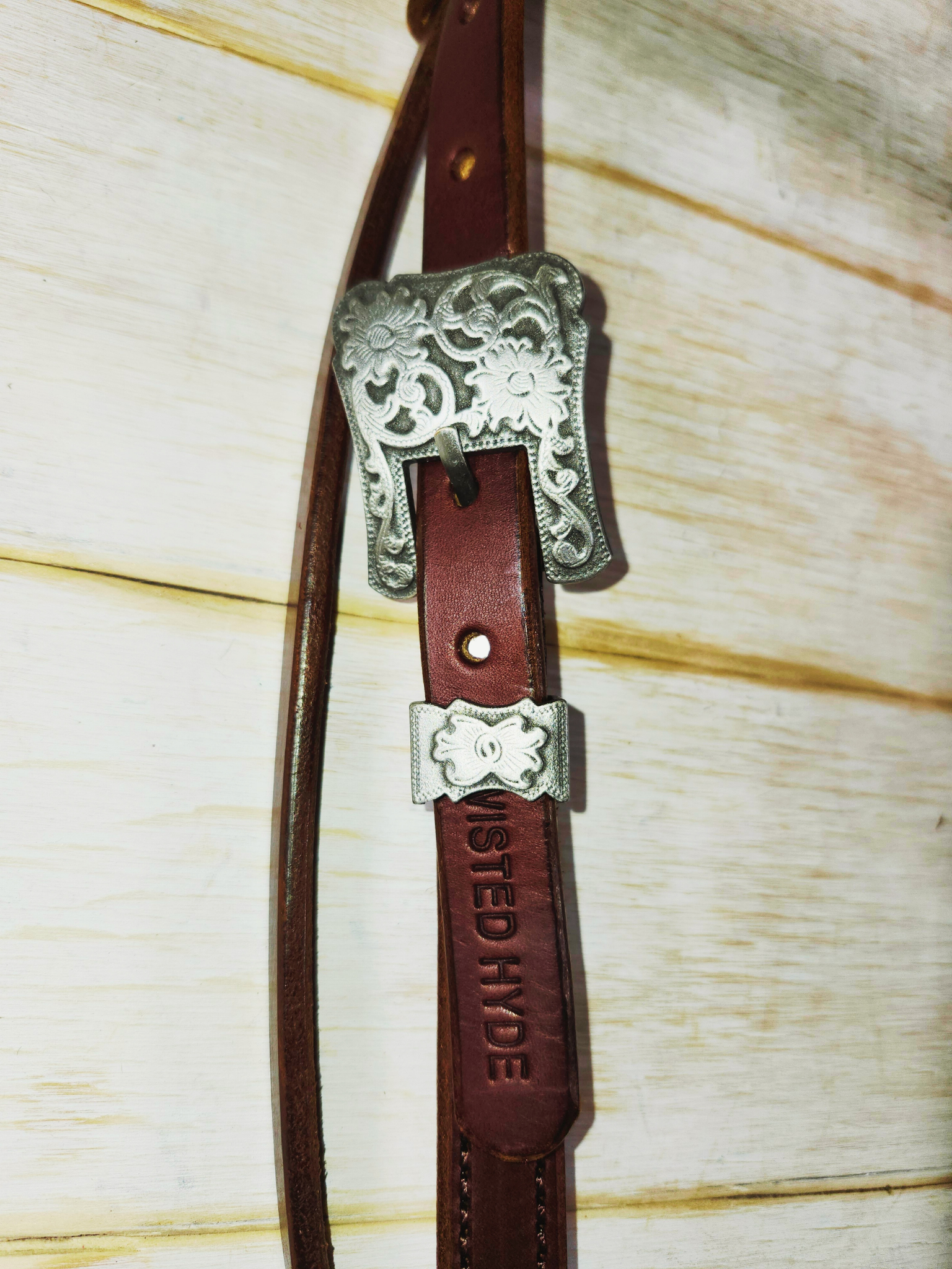 Twisted Hyde Leather Co. is not responsible for purchase of headstalls that don't fit. To ensure proper fit, measure a headstall you currently use from bit to bit. Remember our headstalls have a range of sizes they will fit and can be adjusted with the holes. The measurements are given for every headstall in the description of the item. Bits with a high or long purchase could affect the size of the headstall you need. See the image below that demonstrates how to measure a headstall you currently use with a bit to ensure proper fit. All of our headstalls are full (standard) size unless specified otherwise.
