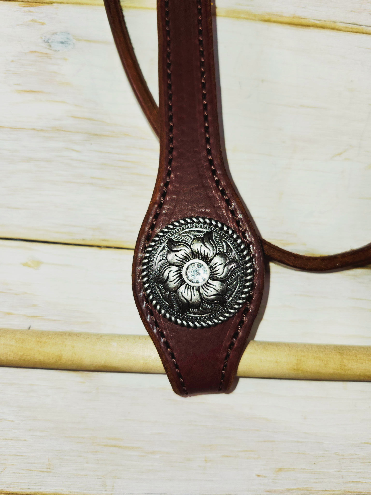 This browband headstall is handmade from top quality buttery smooth chocolate harness leather. Adorned with antiqued silvered conchos and matching buckles, this handcrafted headstall is durable and eye catching.