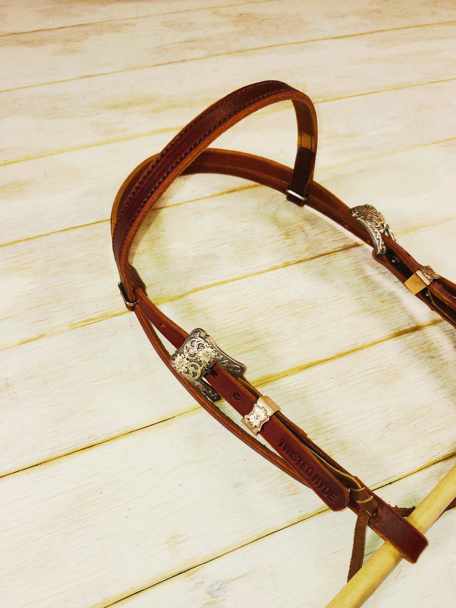 Twisted Hyde Leather Co. is not responsible for purchase of headstalls that don't fit. To ensure proper fit, measure a headstall you currently use from bit to bit. Remember our headstalls have a range of sizes they will fit and can be adjusted with the holes. The measurements are given for every headstall in the description of the item. Bits with a high or long purchase could affect the size of the headstall you need. See the image below that demonstrates how to measure a headstall  you currently use with a bit to ensure proper fit. All of our headstalls are full (standard) size unless specified otherwise.