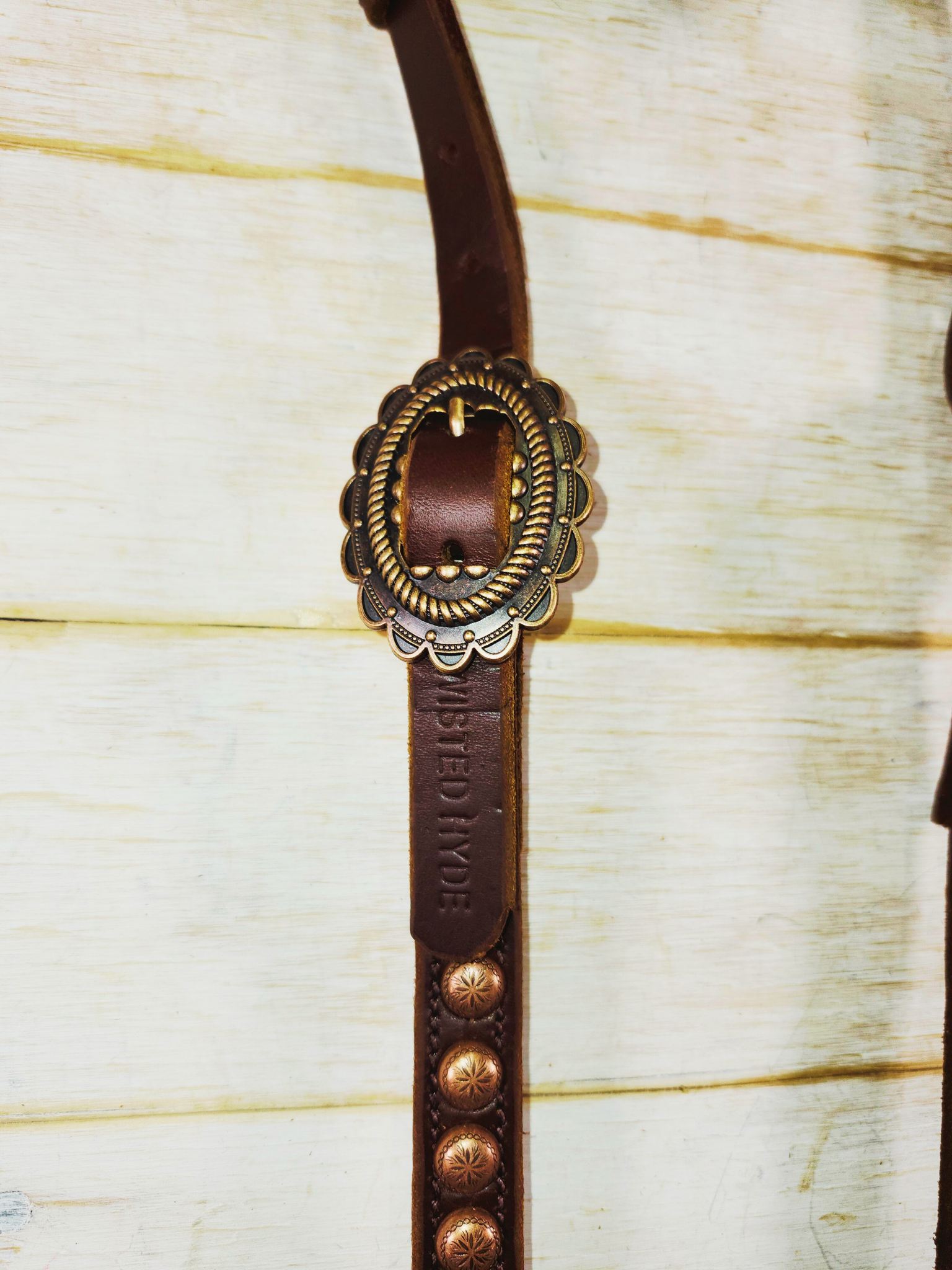 This single ear headstall is handmade from top quality hot oiled harness leather. Adorned with antiqued copper and turquoise conchos, buckles and spots. This handcrafted headstall is durable and eye catching.